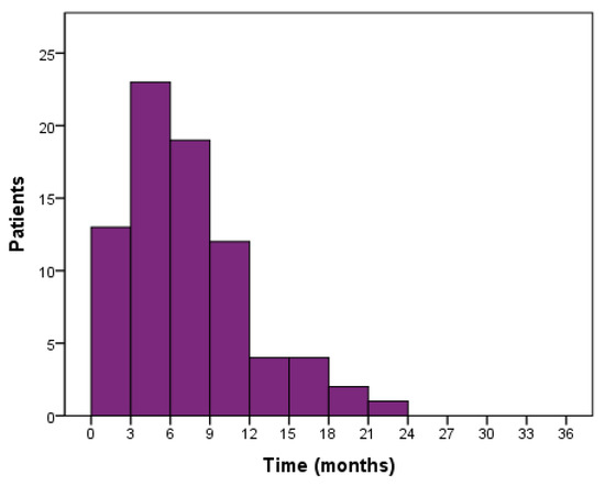 No baseline laboratory value was linked to progression of the disease according to the continuous PFS variable analysis (Table S2). In the discrete variable comparison, baseline MCH (mean corpuscular hemoglobin), MCV (mean corpuscular volume), and CRP (C-reactive protein) were significantly higher in the >9 months group, and CRP in the <60 years group (Supplementary Material, Tables S3–S4). Nevertheless, differences in MCH and MCV were within the common reference margins. Neutr/leuk higher than median (0.65) was associated with decreased PFS (p = 0.013). Inversely, higher than median (>38) trom/leuk ratio was associated with longer PFS (p = 0.018).