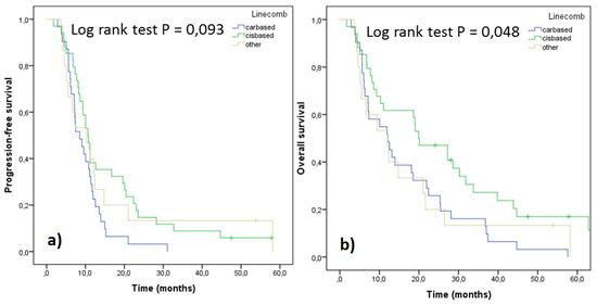 The most common regimens administered to patients were cis/carboplatin combined with gemcitabine (n = 33), followed by platinum doublets containing pemetrexed (n = 19) and vinorelbine (n = 8) (Table 2). Pemetrexed was the most used single agent (n = 5). Cisplatin based regimens resulted in more complete responses (CR) than the carboplatin ones (14.7% vs. 3.2%). Patients treated with carboplatin doublets had slightly more partial responses (PR) and stable disease (SD) but, on the other hand, more disease progression (PD) as a response. Single agents and other combinations were not frequently used, resulting more often in stable disease or disease progression.