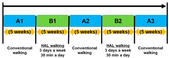 The HAL robot used for gait training is shown in Figure 1. The intervention included two phases: (phase A) conventional gait training and physical therapy for 5 weeks, and (phase B) gait training using the HAL, combined with conventional physical therapy, for 5 weeks. Gait training using the HAL was performed 3 d/week, 30 min/session. Over the 25 weeks of gait training, a consecutive A-B-A-B-A sequence was used, with a 5-week duration for each phase (Figure 2) [9]. The bilateral version of the HAL (small size) robot was used for gait training, under the cybernic voluntary control (CVC) mode. CVC mode supports lower limb movements in response to voluntary lower limb muscle activity [10]. Specifically, under CVC mode, the HAL controller detects the bio-elective signals (BES) generated by the wearer for an intended movement and provides the torque assistance needed to perform the target movement. Normally, BESs of the antagonist and agonist muscles are used by the HAL controller, such as the quadriceps and hamstrings to control the knee. Using the hand controller, the sensitivity adjustment of the amount of assist torque according to BES can be increased or decreased with the control item “assist gain”. However, with central nervous system disorders, this assist gain can be difficult to achieve due to abnormal BES patterns, such as pathological muscle synergy (such a co-contraction of agonist and antagonists at a joint) or spasticity. In these cases, to prevent undesirable levels and/or direction of HAL-assisted motion, the BES can be filtered out, for 0% to 100%, in 10% levels. As an example, for an imbalance in level of muscle contraction or tone between antagonists and agonists, the proportion of the signal from the muscle producing stronger BES can be attenuated to provide the “assist balance” needed to yield a balanced HAL-assisted flexion/extension torque at the joint to achieve the target movement. As a result, the wearer can reproduce a motion that is close to normal. For HAL-assisted gait training, a body weight support system was used to prevent falls during the HAL gait training sessions, with no offloading of body weight during the training. The walking practice time during all interventions was limited to 30 min/d.