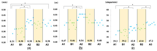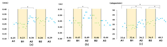 Measured outcomes: (a) maximum walking speed; (b) stride length; and (c) cadence. Numbers in the graph indicate the mean value for each phase. * P < 0.05.