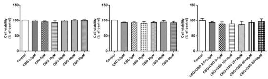 In differentiated NSC-34 cells, we evaluated by an MTT assay the possible toxicity on motoneurons of serial concentrations (2.5, 5, 10, 20, 40, and 80 µM) of CBG and CBD alone and in association with a 1:1 ratio. No significant variation on cell viability was observed at all doses tested (Figure 2). We also analyzed NSC-34 cells incubated with dimethyl sulfoxide (DMSO < 0.1%), and no cytotoxicity was observed (data not shown) in line with our previous study reporting a normal morphological evaluation and nothing was altered in the transcriptome analysis of cells treated with DMSO []. All the experiments were performed in triplicates and repeated three independent times.