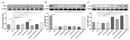 (a) Western blot analysis for TNF-alpha showed a downregulation of TNF-α expression in the pretreated groups ** p < 0.01, **** p < 0.0001 vs. lipopolysaccharide (LPS); #### p < 0.0001 LPS + CBD 2.5 µM vs. LPS + CBD 5 µM. (b) Western blot analysis for IL-10 showed an increase in basal levels of the cytokine in the group pretreated with the CBG–CBD combination at 5 µM dose. **** p < 0.0001 vs. LPS. (c) Western blot analysis for IL-37 showed a statistically significant upregulation in groups pretreated with CBD alone and in association with CBG. **** p < 0.0001 vs. LPS. Blots are representative of three independent experiments. The densitometry analysis of bands representing means ± SEM of three independent experiments in which levels of each protein were normalized for glyceraldehyde 3-phosphate dehydrogenase (GAPDH).