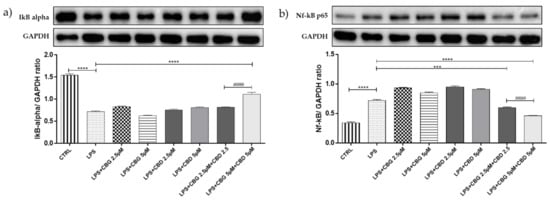 (a) Western blot analysis for cytoplasmic IkB alpha showed high levels of cytoplasmatic IkB alpha in the group pretreated with the CBG–CBD combination at 5 µM dose. (b) Western blot analysis for nuclear NF-kb p65 showed a significant NF-κB nuclear translocation in the groups pretreated with both CBG-CBD combinations. *** p < 0.001, **** p < 0.0001 vs. LPS; #### p < 0.0001 LPS + CBG 2.5 µM + CBD 2.5 µM vs. LPS + CBG 5 µM + CBD 5 µM. Blots are representative of three independent experiments. The densitometry analysis of bands representing means ± SEM of three independent experiments in which levels of each protein were normalized for GAPDH.