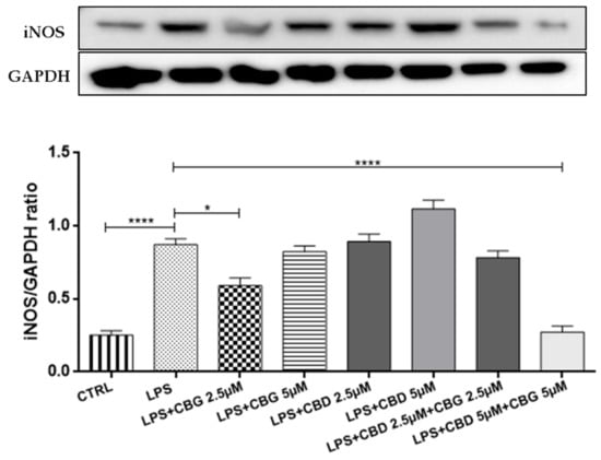 Western blot analysis for iNOS showed an reduction of iNOS expression in the CBG 2.5 µM group. The pre-treatment with the association of CBG–CBD at a 5 µM dose counteracted iNOS expression. * p < 0.05, **** p < 0.0001 vs. LPS. The blot is representative of three independent experiments. The densitometry analysis of bands representing means (±SEM) of three independent experiments in which levels of each protein were normalized for GAPDH.