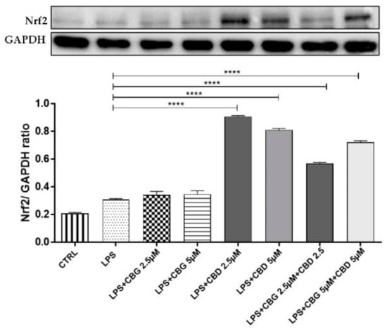 Western blot analysis for Nrf2 shows an increase of Nrf2 nuclear translocation in the groups treated with CBD alone at 2.5 and 5 µM doses and in combination with CBG at a 5 µM dose. **** p < 0.0001 vs. LPS. The blot is representative of three independent experiments. The densitometry analysis of bands representing means (±SEM) of three independent experiments.