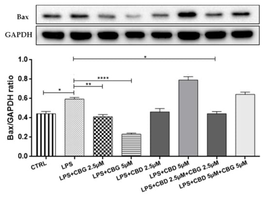 Western blot analysis for Bax. The pre-treatment with CBG alone at 2.5 and 5 µM doses and in combination with CBD at a 2.5 µM dose shows a reduction of Bax expression compared to the LPS group. * p < 0.05, ** p < 0.01, **** p < 0.0001 vs. LPS. The blot is representative of three independent experiments. The densitometry analysis of bands representing means (±SEM) of three independent experiments in which levels of each protein were normalized for GAPDH.