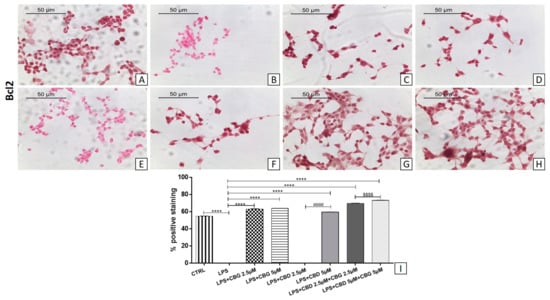 The pre-treatment with all doses of CBG alone and in association with CBD at a 2.5 µM dose reduced Bax expression levels (Figure 7). In addition, immunocytochemistry showed negative staining for Bcl-2 in the LPS group (Figure 8B) compared to the control group (Figure 8A). The pre-treatment with all doses of CBG induced the expression of Bcl-2 (Figure 8C,D). Instead, CBD given alone showed negative staining of Bcl-2 at the 2.5 µM dose (Figure 8E), being effective only at the 5 µM dose (Figure 8F). Both CBG–CBD combinations induced the expression of the Bcl-2 factor (Figure 8G,H) in a dose-dependent manner.