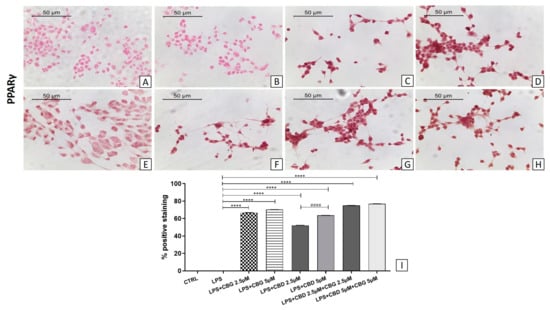 Immunocytochemical analysis for PPARγ in untreated NSC-34 cells (CTRL) (A), cells incubated with medium of LPS-stimulated macrophages (LPS) (B), LPS + CBG 2.5 µM (C), LPS + CBG 5 µM (D), LPS + CBD 2.5 µM (E), LPS + CBD 5 µM (F), LPS + CBG 2.5 µM + CBD 2.5 µM (G), LPS + CBG 5 µM + CBD 5 µM (H). Densitometric analysis for PPARγ (I), **** p < 0.0001 vs. LPS; #### p < 0.0001 LPS + CBD 2.5 µM vs. LPS + CBD 5 µM. The data are representative of three independent experiments. Scale bar: 50 µm. The images were acquired with an objective 40×.
