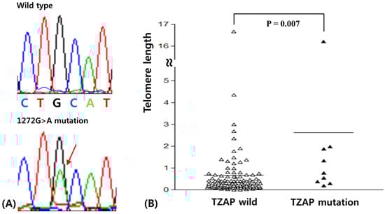 (A) Telomeric zinc finger-associated protein (TZAP) mutation (1272 G/A) in breast carcinomas (BCs). (B) Telomere length difference according to TZAP mutation status.