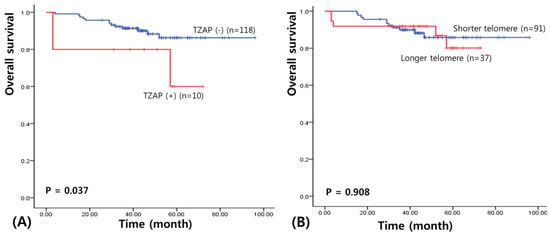 Clinicopathological characteristics of TZAP mutations are summarized in Table 2. The TZAP mutation was found only in the N0 stage of BCs (p = 0.035). This mutation was more frequently found in BC patients with longer telomeres, though it did not reach statistical significance (15.8 vs. 4.4%, p = 0.064). Other characteristics were not associated with TZAP mutations.
