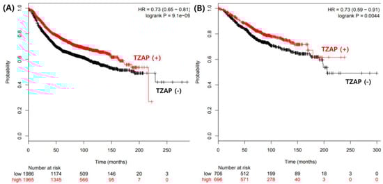 The Cancer Genome Atlas (TCGA) data analysis for prognostic value of TZAP expression. (A) Disease free survival. (B) Overall survival.