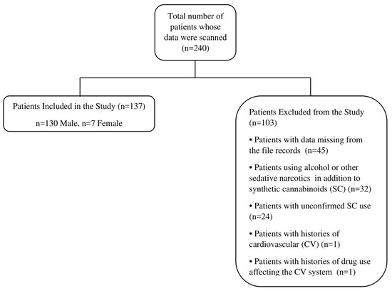 We retrieved the records and examined the files of 240 patients presenting to the adult ED due to SC use between 1 January 2016 and 31 December 2017. Following our assessments, we excluded a total of 103 patients, including 24 whose SC use was uncertain, 32 whom we concluded had used alcohol or other sedative narcotics in addition to SCs, one patient due to the presence of CV disease at history taken from the subject or relatives, one patient with a history of use of drugs affecting the CV system, and 45 due to deficient data in their records (Figure 1).