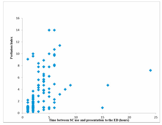Time between SC use and presentation to the emergency department was identified as the single most significant factor in the model established to examine PI levels (p < 0.001) (Table 3).