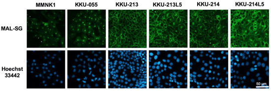 Expression of MAL-SG in CCA cell lines. MAL-SG expression in MMNK1 and CCA cell lines (KKU-213, KKU-214, KKU213-L5, and KKU214-L5) was determined by MAL-II lectin-cyto-fluorescent staining. The signal of Alexa-448 represented MAL-SG (green) and nucleus was stained by Hoechst-33342 (blue).