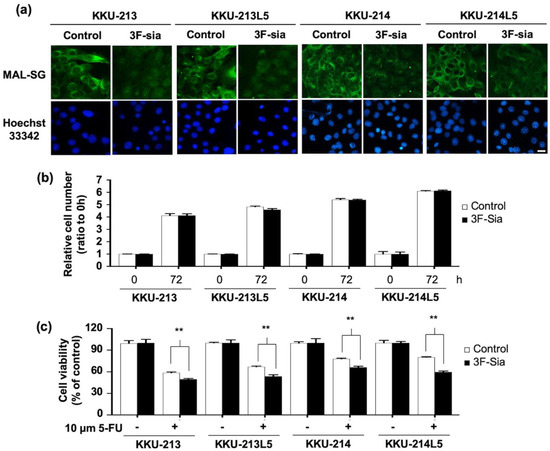 To elucidate the role of sialylation on 5-FU susceptibility of CCA cell lines, they were treated with 50 µM 3F-Sia for 48 h. By this treatment, MAL-SG expression obviously decreased compared with 1% DMSO-treated control cells. Then, the cells were treated with 10 µM 5-FU and cell viability was measured 48 h later. The results showed that, after 5-FU treatment, the viability of 3F-Sia-treated (sialylation suppressed) cells was significantly lower than those of DMSO-treated (high sialylation) controls (p < 0.05, Student’s t-test; Figure 3c).