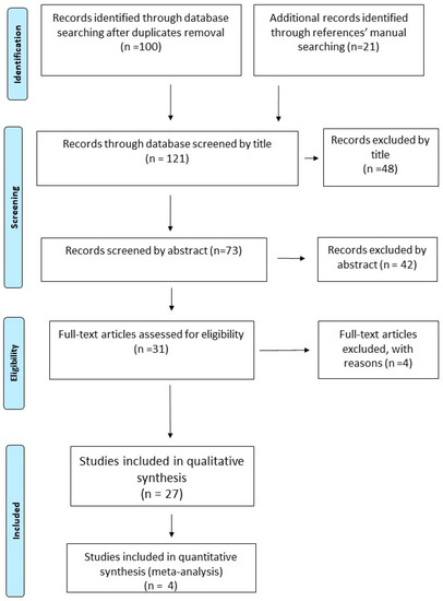 Our initial search in MEDLINE, EMBASE, Scopus/Elsevier, The Cochrane Central Register of Controlled Trials (CENTRAL), USA Clinical Trials registry (clinicaltrials.gov) and The International Web of Science up to 22 October 2018 retrieved 100 potentially relevant articles after de-duplication. Furthermore, manual searching across references of these potentially relevant abstracts led to another 21 potentially relevant articles (Figure 1). Articles were firstly scanned by title by two independent searchers (AA and ID). From the 121 initially retrieved articles, 48 were excluded by title, leaving 73 possibly relevant articles to be scanned by abstract. Of these, 42 were excluded by abstract and the remaining 31 articles were assessed as full texts for eligibility. Among them, 27 original articles were considered as eligible, while 4 articles were excluded. Agreement between authors was quite substantial (Cohen’s k: 0.7973).