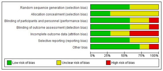 - Random sequence generation (selection bias): The method of allocation sequence generation was assessed as: low risk of bias (random number table, computer random generator) and unclear risk of bias (when the method is not clearly stated)