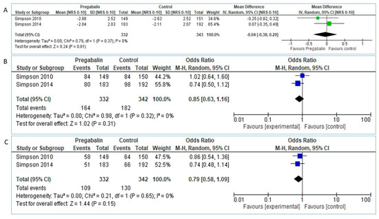 Both studies shared primary efficacy measure, defined as the mean change in average pain as measured by the Gracely Pain Scale (GPS) from baseline to the end of the maintenance phase. Furthermore, both studies followed a subgroup analysis, based on the concomitant use of ARTs. Regarding the first study (Simpson et al. [40]), per protocol analysis of primary outcome results showed a superiority of LTG, over placebo in pain reduction from baseline to study endpoint (Mean Difference (SE): Placebo −0.18 (0.09), LTG −0.55 (0.14), p = 0.03, which however, was not apparent when an intent to treat analysis was conducted. Subgroup analysis showed a significant difference only on patients not exposed to neurotoxin. However, the latter study conducted by the same team (Simpson et al. [41]), enrolling a greater number of subjects, didn’t demonstrated superiority of LTG over placebo, in any of the ART-expose subgroups. Despite the similar methodology and outcomes, pooling of data was not possible, since authors in Simpson et al. [41] study didn’t report any measure of variation in their data but only group mean values.