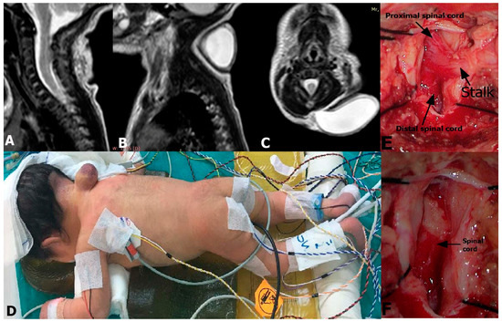 Sagittal (A), (B) and axial (C) T2-weighted magnetic resonance imaging (MRI) show cerebrospinal fluid (CSF)-filled meningocele sac and stalk lying from the cervical spinal cord to the inner wall of the sac. (D) The patient underwent surgical treatment under intraoperative neuromonitoring. (E) After the removal of the meningocele sac, the stalk and the spinal cord became obvious. (F) Spinal cord was detethered after the cutting of stalk at its origin.