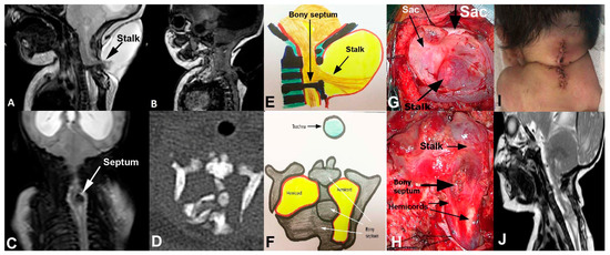 - Singh, S.; Mehrotra, A.; Pandey, S.; Gupta, S.; Bhaisora, K.S.; Gajbhiye, S.; Sardhara, J.C.; Das, K.K.; Srivastava, A.K.; Jaiswal, A.K.; et al. Cystic cervical dysraphism: Experience of 12 cases. J. Pediatr. Neurosci. 2018, 13, 39–45. [Google Scholar] [CrossRef] [PubMed]