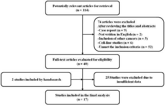 The search process identified 114 potentially relevant articles; however, 74 articles were excluded by screening of the titles and abstracts. Of the remaining 40 studies, 25 articles that failed to meet the inclusion criteria were further excluded. We manually searched the reference lists of the selected articles and found two more relevant articles. Eventually, a total of 17 studies were included in the meta-analysis [21,27,28,29,30,31,32,33,34,35,36,37,38,39,40,41,42] (Figure 1).