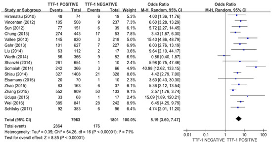 A total of 9764 patients from the 17 studies were included in the meta-analysis to determine the association of TTF-1 expression and EGFR mutations [21,27,28,29,30,31,32,33,34,35,36,37,38,39,40,41,42]. The combined OR of 5.19 (95% CI: 3.60–7.47, p < 0.00001, random-effects model, Figure 2) indicated that NSCLCs with TTF-1 overexpression exhibited significantly higher rate of EGFR mutations. There was a significant heterogeneity among studies (X2 = 54.26, p < 0.00001, I2 = 71%).