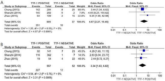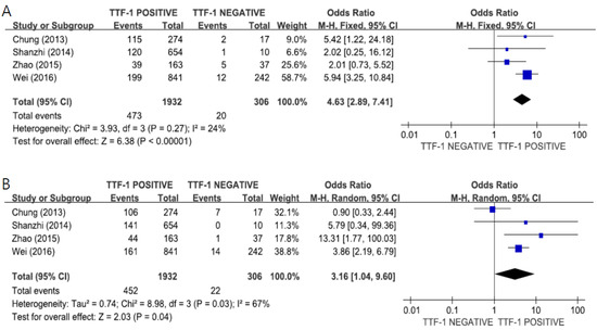 Among EGFR mutations, deletion in exon 19 and L858R mutation in exon 21 are common, accounting for more than 90% of all EGFR mutations. Some studies conducted subgroup analysis according to EGFR mutation subtype and reported that positive TTF-1 expression was only significantly correlated with EGFR mutation in exon 21, and not on exon 19 [34,38]. However, Zhao et al. also observed a significant correlation of TTF-1 positivity with EGFR mutation in exon 21 in Chinese patients with lung ADC [38]. In the current meta-analysis, the pooled data from four studies [30,34,38,41] indicated a significant relationship between TTF-1 expression and EGFR mutation in both exon 19 (OR = 4.63, 95% CI: 2.89–7.41, p < 0.00001) and exon 21 (OR = 3.16, 95% CI: 1.04–9.60, p = 0.04).