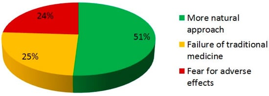 Even if it has been reported that single patients were more likely to use CAM than married or cohabiting patients [,], the data of this study suggest that is not due to the single status but to the absence of children, which often accompanies the single status. Since children are generally looked after by women more than men, it seems that having children may constitute a barrier for women to pursue CAM use. In recent years, there has been a growing interest in CAM and it is no surprise that a good knowledge of these therapies was significantly higher in CAM users (46%) compared to those who did not use it (18%). This confirms that knowledge of CAM is fundamental for their estimation, as reported by Saha et al. who found that a poor level of knowledge about CAM was the main reason for discontinuing its use, in pharmacy college students [].