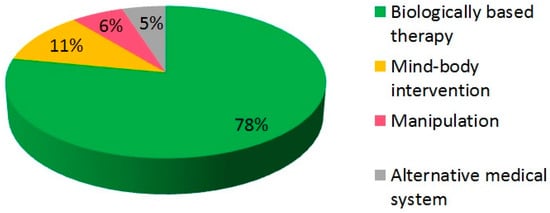 Natural remedies, such as nutraceuticals and herbal compounds, resulted as the most commonly used CAM. Indeed, 37% of patients reported the use of herbs, 26% the use of nutraceutical compounds, and 15% the use of vitamins, which are all classified as biologically based therapies. Meditation was preferred by 6 (10%) patients, while one woman (1%) reported that art, which belongs to the mind–body intervention category as well as meditation, was the main CAM she used to treat her gastrointestinal symptoms. Among manipulation therapies listed, including massage, chiropractic, and acupuncture, the only type chosen was massage. Similarly, the unique type of alternative medical system appreciated for its results, among those listed in the questionnaire, was homeopathy. These results are summarized in Figure 3.