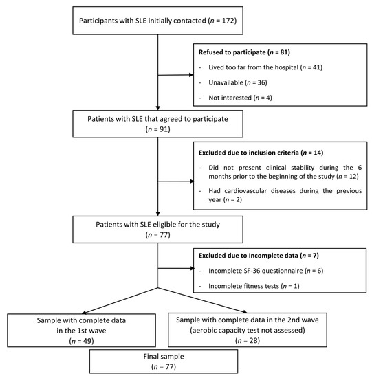 The flowchart of the participants included in this study is presented in Figure 1. From a total of 172 patients initially invited, 81 refused to participate (41 patients reported living very far from the hospital, 36 were not able to find time to perform the evaluations, and 4 were not interested), 12 patients did not present clinical stability during the 6 previous months, and 2 patients had cardiovascular disease during the previous year. A total of 77 women with SLE (mean age 43.2, SD 13.8) met the inclusion criteria, agreed to participate, and were assessed in two waves (49 women in October 2016 and 28 women in February 2017). Both evaluations were identical, with the exception that the 6 min walk test (6MWT) and Siconolfi step test were not carried out (n = 28) in the wave of 2017 due to timing issues. One woman did not perform the handgrip strength test and the back-scratch test due to a wrist injury.