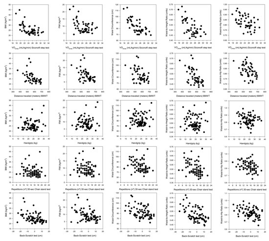 The aim of the present study was to evaluate the association of different components of physical fitness (CRF, muscular strength, and flexibility) with body composition (BMI, FMI, waist circumference, waist-to-height ratio, and waist-to-hip ratio) in women with SLE.