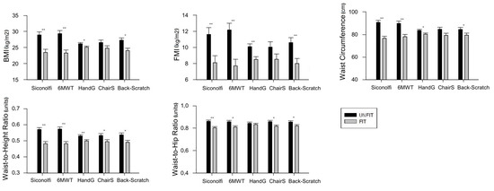 Figure 3 shows the differences in body composition between patients categorized as “fit” and those categorized as “unfit” according to the median value for each fitness test. Regarding CRF, women categorized as “unfit” (using the Siconolfi step test) had a higher BMI (mean difference 5.44 kg/m2; 95% CI 2.61–8.26; p < 0.001), FMI (mean difference 3.51 kg/m2; 95% CI 0.99–6.03; p = 0.007), waist circumference (mean difference 14.18 cm; 95% CI 8.72—19.64; p < 0.001), waist-to-height ratio (mean difference 0.08 units; 95% CI 0.05–0.12; p < 0.001), and waist-to-hip ratio (mean difference 0.05 units; 95% CI 0.02–0.09; p = 0.001) than those categorized as “fit”. Women categorized as “unfit” (using the 6MWT) had a higher BMI (mean difference 6.02 kg/m2; 95% CI 3.24–8.81; p < 0.001), FMI (mean difference 4.46 kg/m2; 95% CI 2.02–6.90; p = 0.001), waist circumference (mean difference 11.81 cm; 95% CI 5.70–17.96; p < 0.001), waist-to-height ratio (mean difference 0.09 units; 95% CI 0.05–0.12; p < 0.001), and waist-to-hip ratio (mean difference 0.05 units; 95% CI 0.01–0.08; p < 0.008) than those categorized as “fit”. Regarding strength, women categorized as “unfit” (using the handgrip strength test) had a higher BMI (mean difference 1.08 kg/m2; 95% CI 0.10–2.05; p = 0.03), FMI (mean difference 1.59 kg/m2; 95% CI 0.58–2.59; p = 0.002), waist circumference (mean difference 3.34 cm; 95% CI 0.45–6.23; p = 0.024), and waist-to-height ratio (mean difference 0.03 units; 95% CI 0.008–0.05; p = 0.008) than those categorized as “fit”. Women categorized as “unfit” (using the 30-sec chair stand test) had a higher waist-to-height ratio (mean difference 0.03 units; 95% CI 0.002–0.07; p = 0.041), and waist-to-hip ratio (mean difference 0.04 units; 95% CI 0.01–0.07; p = 0.011) than those categorized as “fit”. Regarding flexibility, women categorized as “unfit” (using the back-scratch test) had a higher BMI (mean difference 3.21 kg/m2; 95% CI 1.16–5.27; p = 0.003), FMI (mean difference 2.59 kg/m2; 95% CI 0.82–4.36; p = 0.005), waist circumference (mean difference 5.08 cm; 95% CI 0.02–10.14; p = 0.049), waist-to-height ratio (mean difference 0.04 units; 95% CI 0.01–0.08; p = 0.007), and waist-to-hip ratio (mean difference 0.03 units; 95% CI 0.005–0.06; p = 0.022) than those categorized as “fit”.