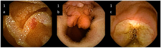 Two endoscopists, who were blind to each patient’s history (A.C.; M.P.) and experienced in VCE (more than 100 previous examinations), reviewed the videos. The capsule endoscopy findings were assessed. The small bowel area was divided into three tertiles (proximal, middle, and distal) based on recording time duration [15]. Lesions were defined as follows: (a) “petechia”: circular area of crimson mucosa with preservation of villi; (b) “denuded area”: loss of villous architecture without clear breach of the epithelium; (c) “angiodysplasia”: enlarged blood vessels, usually a consequence of artero-venous malformations [16]. Other recorded alterations were: Mucosal breaks (i.e., ulcers and erosion), hemorrhagic areas, strictures, and neoplasms. The Lewis score was estimated where indicated [15]. This score characterizes small bowel mucosal inflammatory changes by evaluating three parameters: Villous edema, ulcer, and stenosis. A score of <135 describes a normal/clinically insignificant picture or a mild inflammation, while a score between 135 and 790, a moderate, and a score >790, a severe inflammation. Due to the characteristics of the Lewis score, its application was considered inappropriate for angiodysplasiae and cancers; therefore, in such cases it was not calculated.