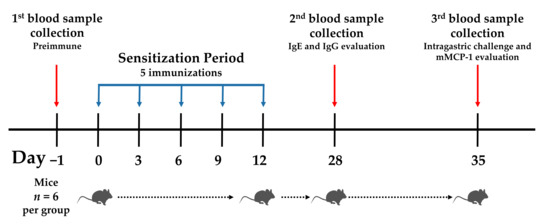 Following sensitization, an intragastric challenge was carried out on day 35. For this purpose, a solution of the relevant protein (0.25 mL at 10 mg/mL) was administered using plastic feeding tubes (Instech Laboratories, Inc., Cat. 20 GA × 38 mm). After 30 min of challenge, the mice were bled from the tail vein, and serum samples were obtained and stored at −80 °C until their use (Figure 1).