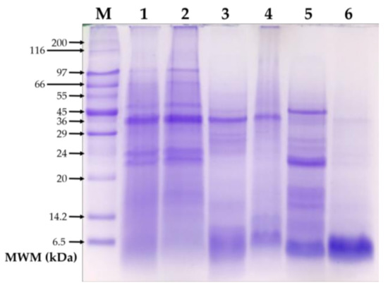 Figure 2 shows the electrophoretic pattern of the total protein and protein fractions from non-extruded and extruded amaranth. The electrophoretic pattern of total proteins remained consistent before and after extrusion (Figure 2, lanes 1 and 2). However, the pattern of the albumin and globulin fractions changed after the extrusion process (Figure 2, lanes 3–6). Overall, albumin and globulin fractions from non-extruded amaranth showed more protein bands than their extruded counterparts. The protein bands between 24 and 29 kDa, which are visible in the albumins from non-extruded amaranth, were not detected after the extrusion process. In the globulin fraction, most protein bands between 14.2 and 45 kDa were not detected in the globulin fraction from extruded amaranth.