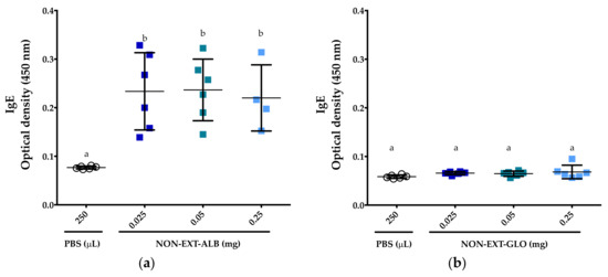 IgE responses to albumins and globulins. (a) Responses to the albumin fraction from non-extruded amaranth (NON-EXT-ALB); (b) Responses to the globulin fraction from non-extruded amaranth (NON-EXT-GLO). All serum samples tested were collected after the mice underwent a 28-day protocol of sensitization. PBS: Phosphate-buffered saline. Comparisons in each figure were carried out using ANOVA/Tukey tests. Vertical bars indicate standard deviations. Different letters indicate significant differences (p < 0.05).