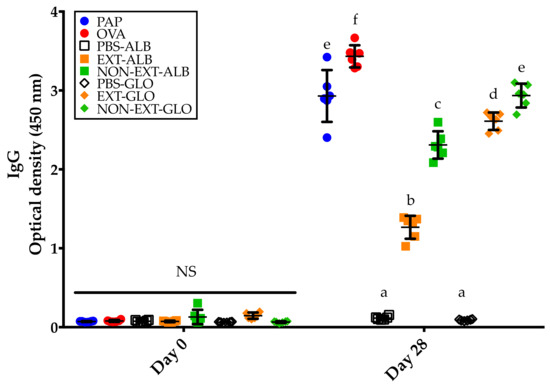 IgG responses to the different proteins tested. The evaluations were carried out in serum samples collected before and after the mice underwent the 28-day sensitization protocol. PAP: Potato acidic phosphatase (0.5 mg); OVA: Ovalbumin (0.05 mg); PBS-ALB: Phosphate-buffered saline as control for albumins; EXT-ALB: Extruded albumins (0.05 mg); NON-EXT-ALB: Non-extruded albumins (0.05 mg); PBS-GLO: Phosphate-buffered saline as control for globulins; EXT-GLO (0.25 mg): Extruded globulins; NON-EXT-GLO: Non-extruded globulins (0.25 mg). Comparisons at day 0 and 28 were carried out separately using ANOVA/Tukey tests. Vertical bars indicate standard deviations. Different letters indicate significant differences (p < 0.05).