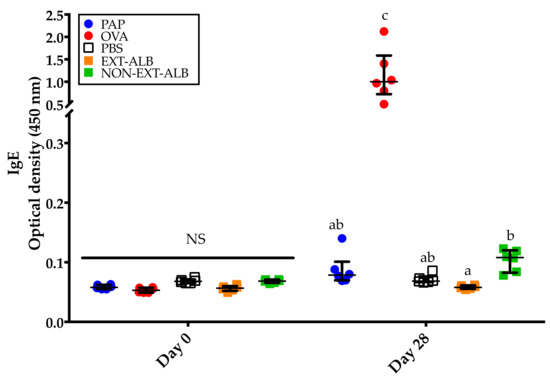 IgE responses to different proteins tested. The evaluations were carried out in serum samples collected before and after the mice underwent the 28-day sensitization protocol. PAP: Potato acidic phosphatase (0.5 mg); OVA: Ovalbumin (0.05 mg); PBS: Phosphate-buffered saline; EXT-ALB: Extruded albumins (0.05 mg); NON-EXT-ALB: Non-extruded albumins (0.05 mg). Comparisons at day 0 and 28 were carried out separately using Kruskal–Wallis/Dunn tests. Vertical bars indicate interquartile ranges. Different letters indicate significant differences (p < 0.05).