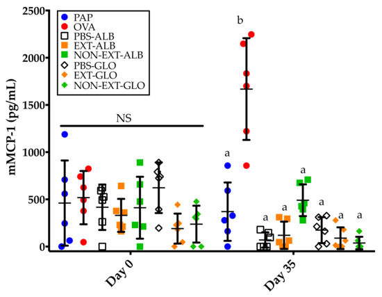 Serum mMCP-1 concentrations before (day 0) and after (day 35) intragastric challenges (2.5 mg). PAP: Potato acidic phosphatase (0.5 mg); OVA: Ovalbumin (0.05 mg); PBS-ALB: Phosphate-buffered saline as control for albumins; EXT-ALB: Extruded albumins (0.05 mg); NON-EXT-ALB: Non-extruded albumins (0.05 mg); PBS-GLO: Phosphate-buffered saline as control for globulins EXT-GLO: Extruded globulins (0.25 mg); NON-EXT-GLO: Non-extruded globulins (0.25 mg). Comparisons at day 0 and 35 were carried out separately using ANOVA/Tukey tests. Vertical bars indicate standard deviations. Different letters indicate significant differences (p < 0.05).