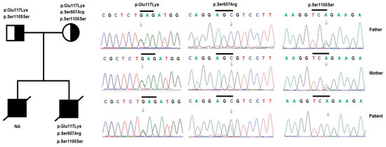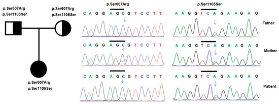 Variants in the NPHS1 gene were identified by sequencing in patient 1 and her family. Pedigree of the patient’s family and two heterozygous variants p.Ser607Leu and p.Ser1105Ser in the NPHS1 gene, that were identified in the patient and her father.