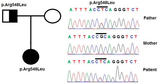 Variants in the PLCE1 gene were identified by sequencing in patient 1 and her family. Pedigree of the patient’s family and variant p.Arg548Leu in the PLCE1 gene, that was identified in the patient and her parents.