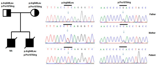 Variants in the PLCE1 genes were identified by sequencing in patient 2 and his family. Pedigree of patient’s and two heterozygous variants p. Arg548Leu and p.Pro1575Arg in the PLCE1 gene were identified in the patient and his parents.