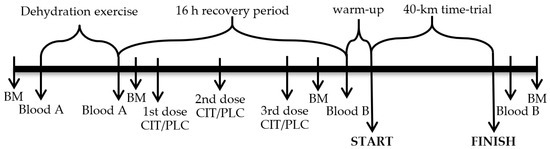 Study protocol. Arrows indicate time points for measurements or blood sampling, sodium citrate or placebo (CIT/PLC) administration and 40-km time-trial start and finish. Blood A indicates blood samples in which hematocrit and hemoglobin concentration was measured; Blood B indicates blood samples in which hematocrit and concentrations of hemoglobin, hormones, glycose and lactate were measured; BM is body mass.