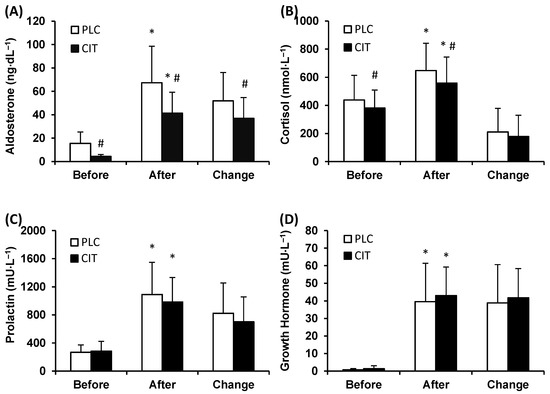 Plasma aldosterone (A), serum cortisol (B), prolactin (C), and growth hormone (D) concentration in placebo (PLC) and sodium citrate (CIT) trials before and after 40 km time-trial (mean ± SD; n = 20). Significantly different (p < 0.05): * from Before; # from PLC.