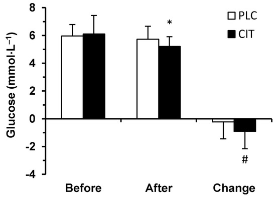 Serum glucose concentration in placebo (PLC) and sodium citrate (CIT) trials before and after 40 km time-trial (mean ± SD; n = 20). Significantly different (p < 0.05): * from Before; # from PLC.