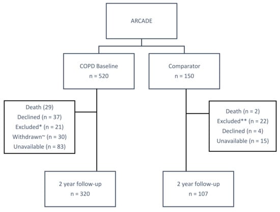 - Gale, N.S.; Albarrati, A.M.; Munnery, M.M.; Munnery, I.C.; Irfan, M.; Bolton, C.E.; Rambaran, C.N.; Singer, R.M.T.; Cockcroft, J.R.; Shale, D.J. Assessment of risk in chronic airways disease evaluation (arcade) protocol and preliminary data. Chronic Respir. Dis. 2014, 11, 199–207. [Google Scholar] [CrossRef]