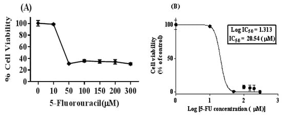 Cell cytotoxicity and IC50 dose for 5-FU were detected using the MTT colorimetric assay []. Cells were seeded at a density of 5000 cell/well in a 96-well plate. After overnight incubation, the cells were treated in triplicate with different concentrations of curcumin (1, 5, 10, 15, 20, 25, 30, and 50 μM), 5-FU (0, 10, 50, 100, 150, 200, and 300 µM), and DMSO as the vehicle. After 72 h incubation, the medium was aspirated from the wells and 20 µL of MTT solution (5 mg/mL in PBS) was added to each well, then incubated at 37 °C, 5% CO2, for 5 h, and the formazan crystal was solubilized using 200 μL DMSO. The samples were read at 570 nm on a microplate reader (Bio-Tek Instruments, Winooski, VT, USA).