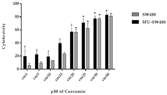 Effect of curcumin (CUR) on the viability of SW480 and 5-FU-treated cells. SW480 and 5FU-SW480 cells were treated with curcumin at different concentrations and their viability was determined by the MTT assay. Data are the average results of three independent experiments. †, * denote statistically significant difference (p < 0.05) when compared to the SW480 and control cells, respectively.
