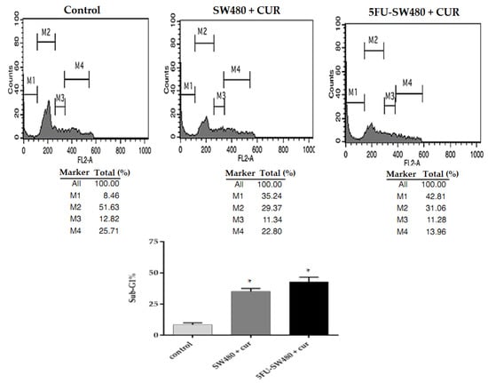 Evaluation of apoptosis by of SW480 and 5FU-SW480 PI flow cytometry. The cell lines (0.5–0.1 × 106) were treated with curcumin (20 μM). Harvested cells stained with PI (50 mg/mL) were analyzed by FACS. The M1, M2, M3, and M4 bars show the sub-G0/G1, G0/G1, S, and G2/M phases, respectively. Each value represents the average of three independent experiments ± SE. * denotes a statistically significant difference (p < 0.05) compared to the control cells.