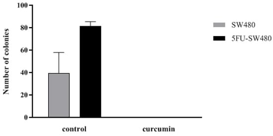 To investigate the proliferation capacity of the cells, the effect of curcumin on the clonogenic survival of SW480 cells and their 5-FU-resistant counterparts were examined. Interestingly, curcumin (20 µM, 14 days) markedly prevented the ability of both the SW480 cells and 5FU-SW480 to form colonies (Figure 4). These results indicate that curcumin, at a concentration of 20 µM, had antiproliferative and antitumor effects on both SW480 and chemoresistant 5FU-SW480 cells.